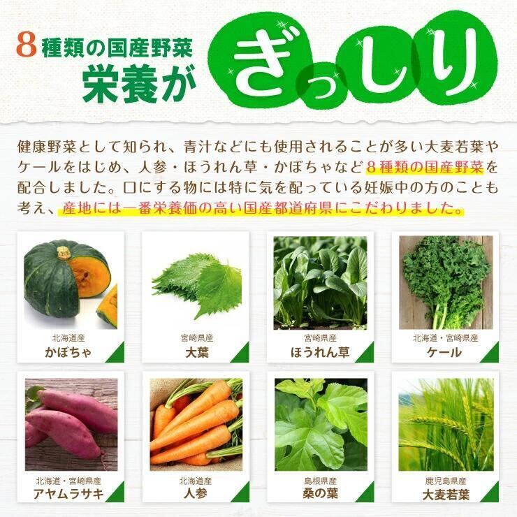 還元麦芽糖水飴(国内製造)、酵母(マンガン含有)、酵母(亜鉛含有)、大麦若葉パウダー、ケールパウダー、さつまいもパウダー、酵母(銅含有)、酵母(クロム含有)、ほうれん草パウダー、南瓜パウダー、人参パウダー、桑の葉パウダー、大葉パウダー/サンゴカルシウム、酸化マグネシウム、セルロース、ピロリン酸第二鉄、V.C、ステアリン酸カルシウム、プルラン、微粒二酸化ケイ素、シェラック、V.E、葉酸、V.B6、V.B2、V.B1、βカロテン、V.D、V.B12、カルナウバウロ
