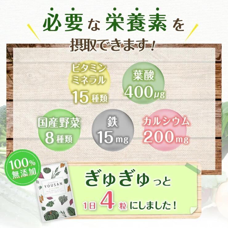 ・1日4粒のサプリで、葉酸:400μg、カルシウム:200mg、鉄分:15mg、ビタミン・ミネラル15種類、国産野菜8種類、摂取できます。