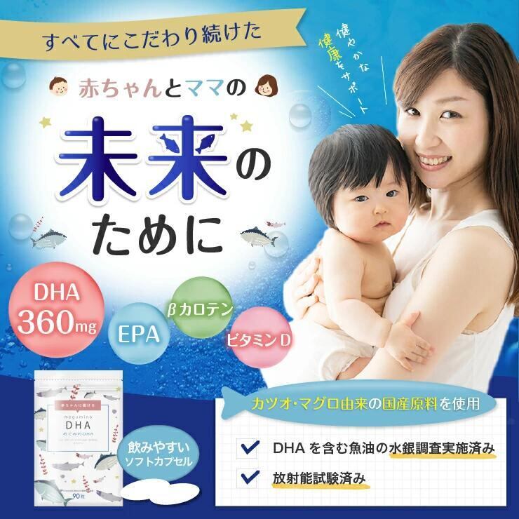 ・「めぐみのDHA」のサプリは、DHA、EPA、βカロテン、ビタミンDなど、赤ちゃんの発育に必要な成分を配合したサプリメントです。