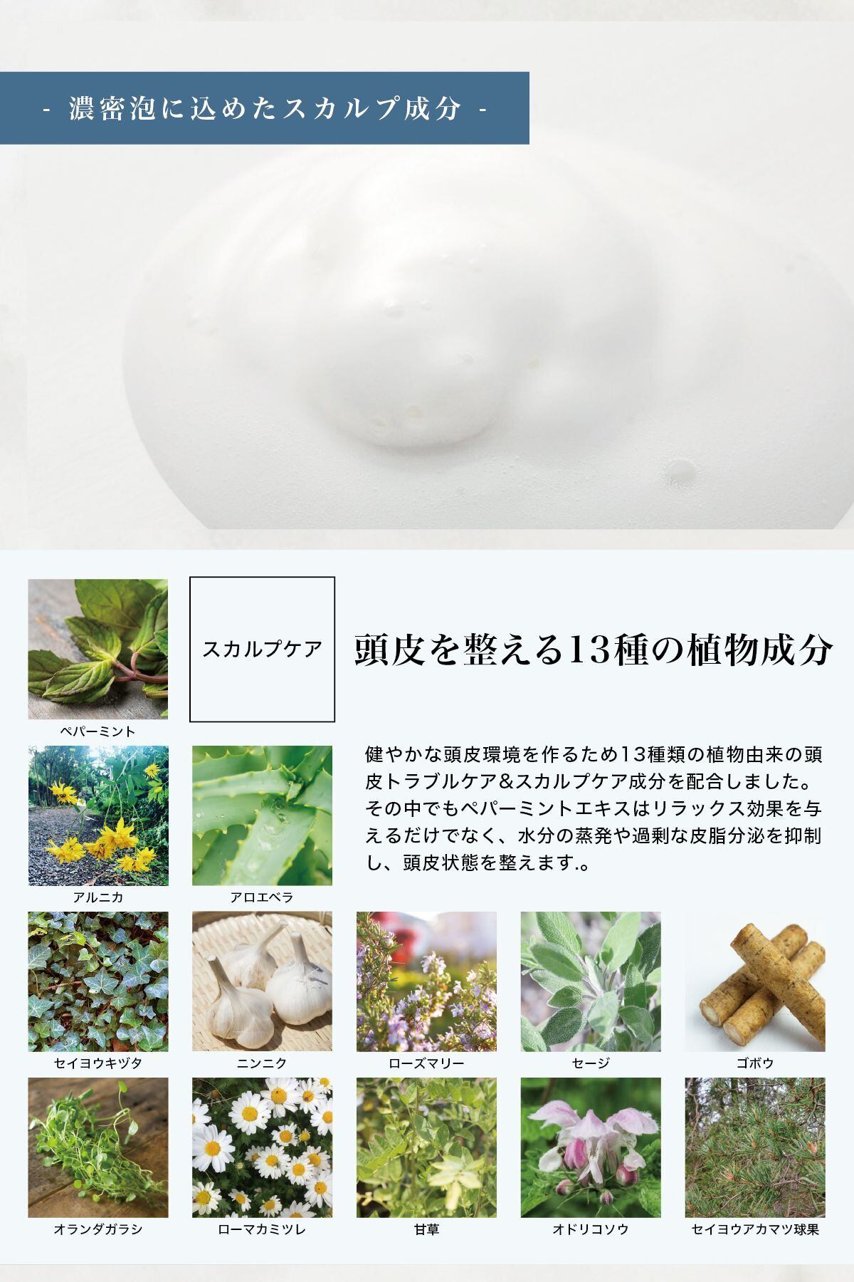 成分 水、ココイルグルタミン酸TEA、BG、ラウリウベタイン、コカミドメチルMEA、二酸化炭素、加水分解ケラチン(羊毛)、グリチルリチン酸2K、アルニカ花エキス、γ-ドコサラクトン、コーマカミツレ花エキス、ジラウロイルグルタミン酸リシンNa、オドリコソウ花/葉/茎エキス、ニンニク根エキス、セージ葉エキス、オランダガラシ葉/茎エキス、アロエベラ葉エキス、加水分解コラーゲン、ヒドロキシプロピルキトサン、プロパンジオール、ラウリン酸ポリグリセリル-10、ポリクオタニウム-10、ポリクオタニウム-7、クオタリウム-18、ベヘントリモニウムクロリド、キサンタンガム、フェトステロールズ、エタノール、メチルパラベン、プロピルパラベン、メントール、香料